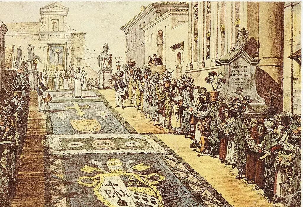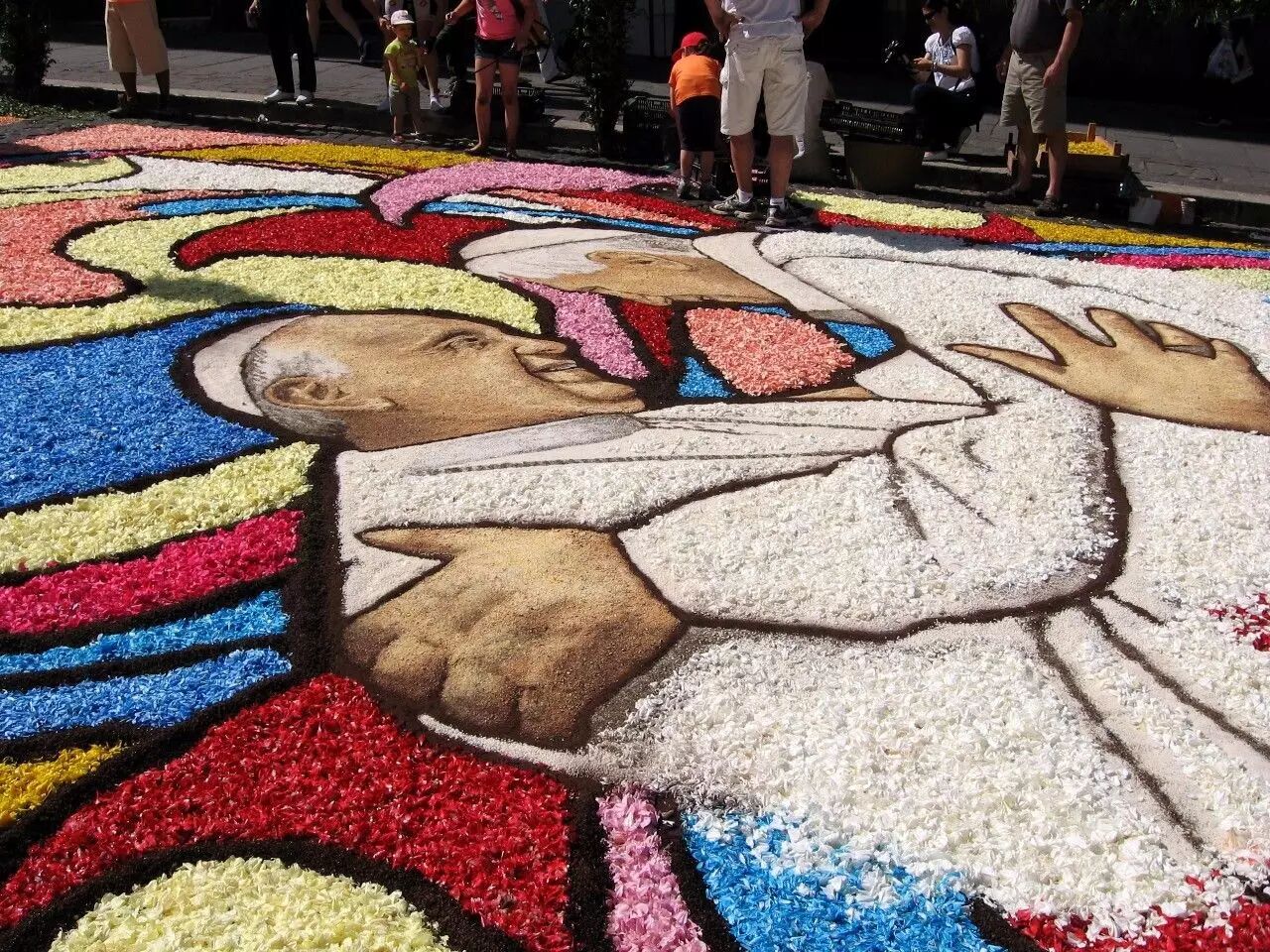 據(jù)記載,第一個花卉地毯創(chuàng)造于1625年6月29的圣彼得圣保羅節(jié),在梵蒂岡大教堂門前,梵蒂岡的工匠本篤德雷伊和他的兒子彼得使用花瓣,栩栩如生的展現(xiàn)出圣彼得和圣保羅兩位圣人,后來的人們繼續(xù)采用這種方式加以慶祝。