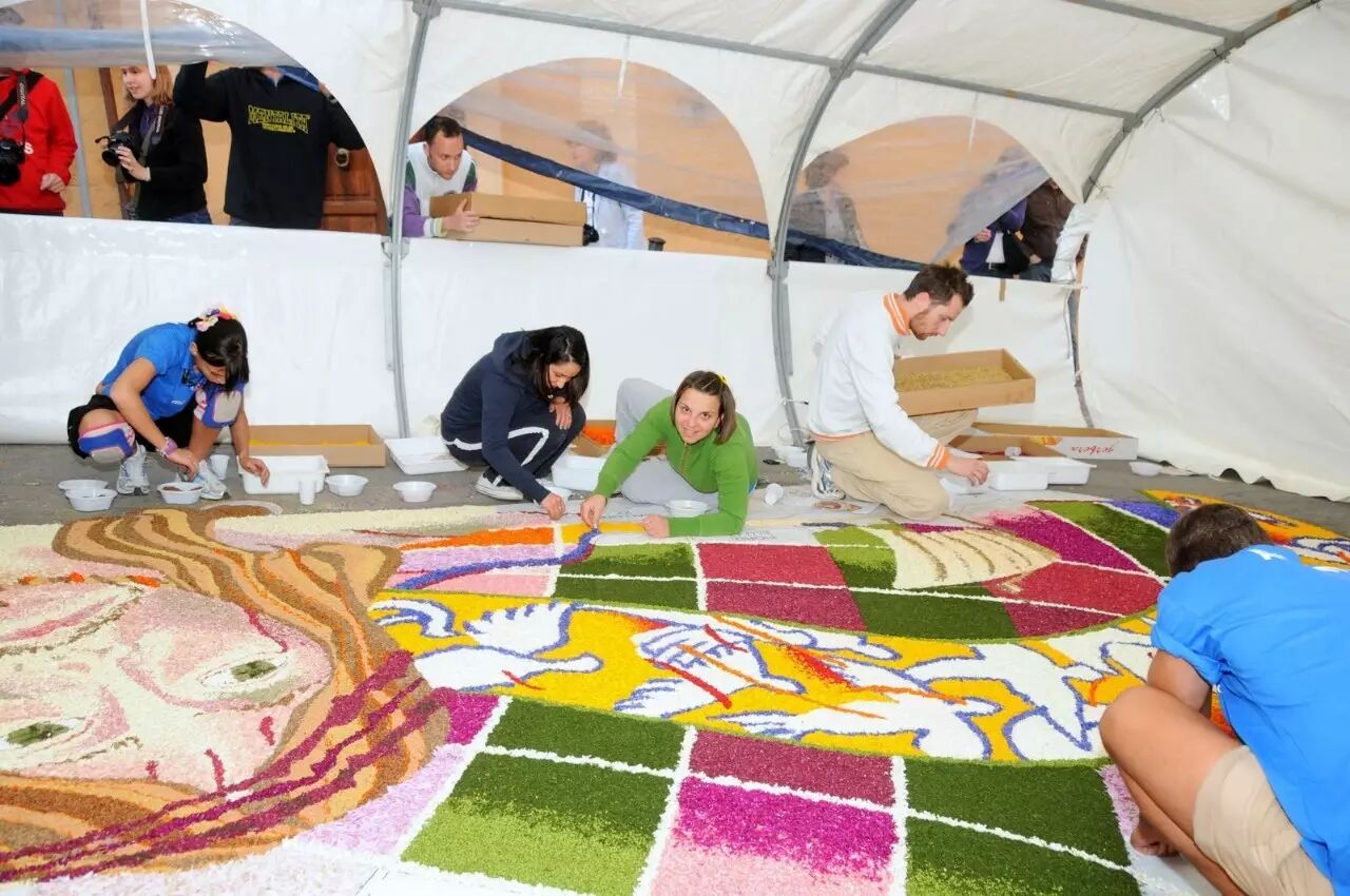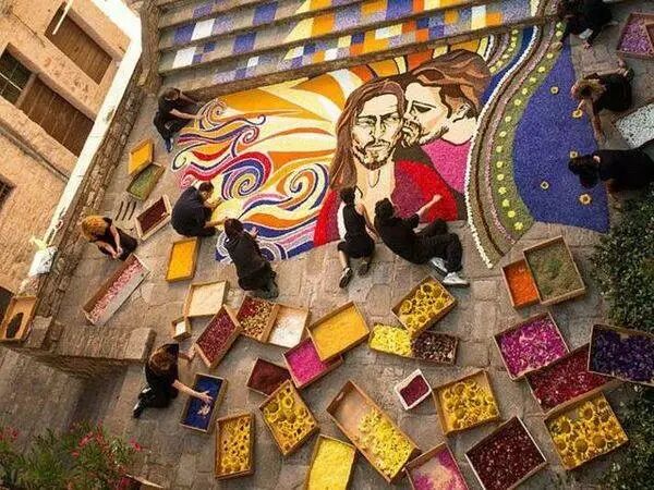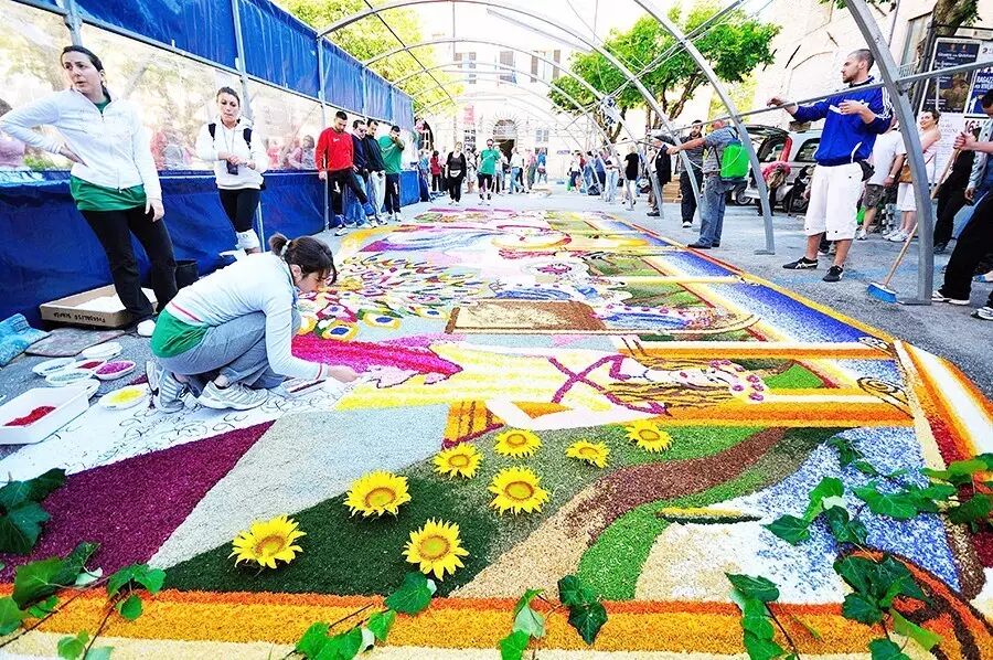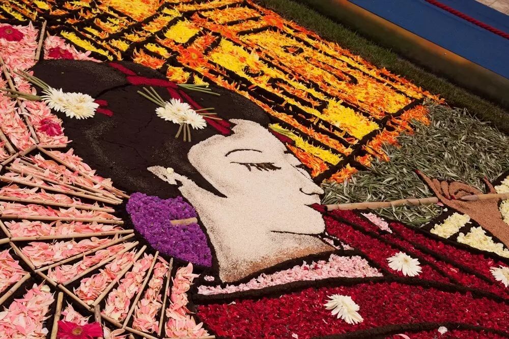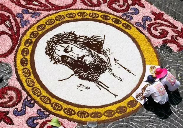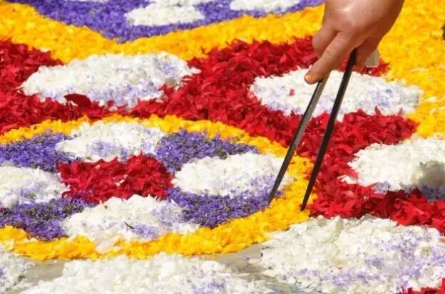 在節(jié)日期間人們會用各色繽紛的花瓣鋪設在街頭,創(chuàng)造出驚人的藝術畫作,有時泥土,豆子,新鮮的水果也會派上用場。