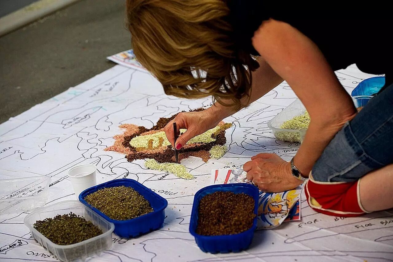 人們發(fā)揮出十足的想象力用粉筆在路面勾畫輪廓,或者直接將設計圖鋪好;最后就是按照上面的指示填充花瓣和種子,過程中不使用任何粘著劑。