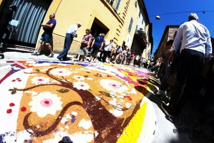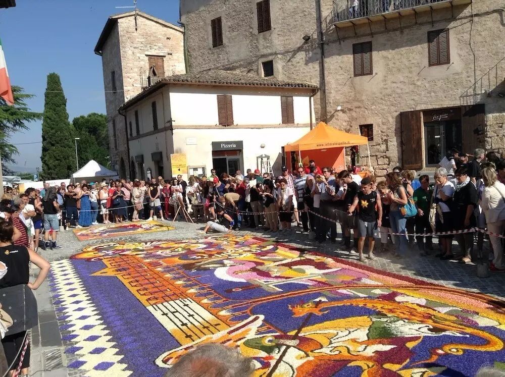 翁布里亞大區(qū)的斯佩洛(Spello)花節(jié)則更像整個小鎮(zhèn)的狂歡節(jié),花毯遍布全城。其中使用的花朵在幾個月前就已經(jīng)開始收集,