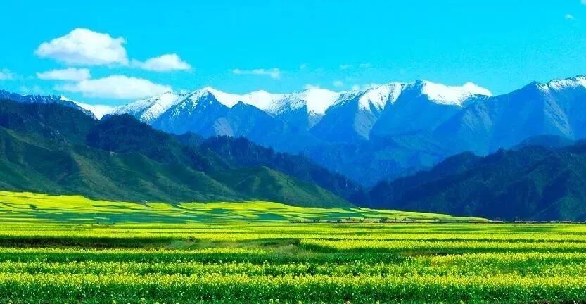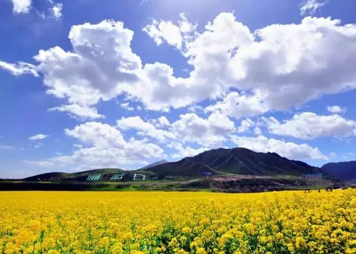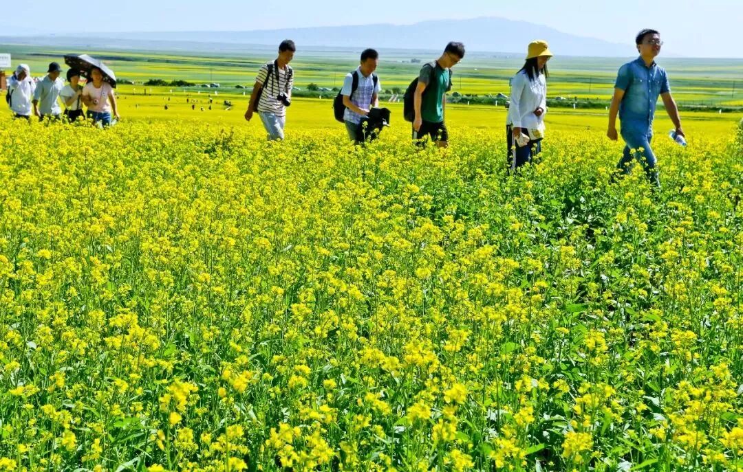 七月,甘肅省張掖市民樂縣扁都口的上萬畝油菜花正在競相開放,黃色的油菜花海與草原綠野相連,猶如一塊天然地毯,在藍(lán)天白云的映襯下美不勝收。
