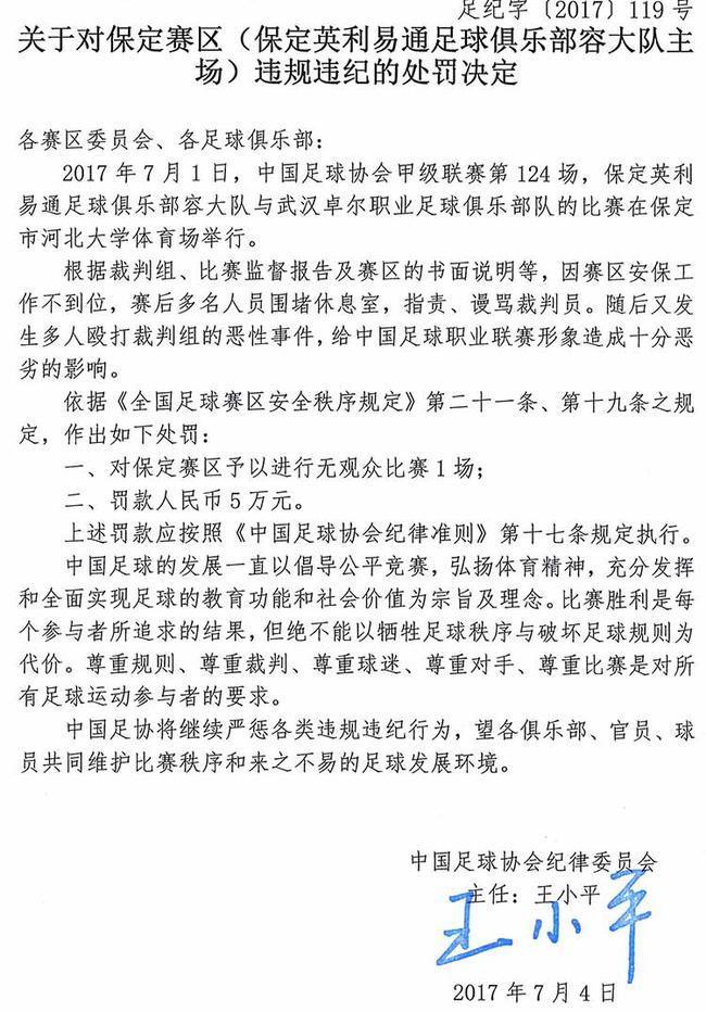 保定賽區(qū)被罰空場1場