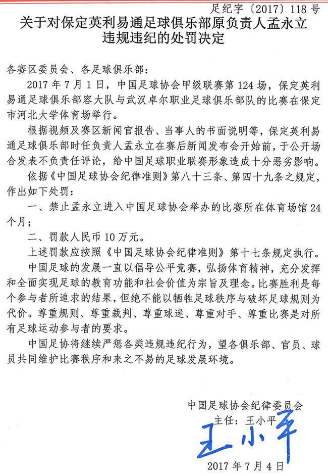 針對保定容大退賽事件,中國足協(xié)連開4張罰單。容大俱樂部共遭到26萬元的罰款,這也創(chuàng)造了足協(xié)處罰金的紀(jì)錄。除了罰金之外,其他的處罰也十分嚴(yán)苛:包括容大賽區(qū)遭到空場1場、教練邦帥禁止進(jìn)入替補(bǔ)席兩場、董事長孟永立禁止進(jìn)入中國足球協(xié)會舉辦的比賽所在體育場館24個月。