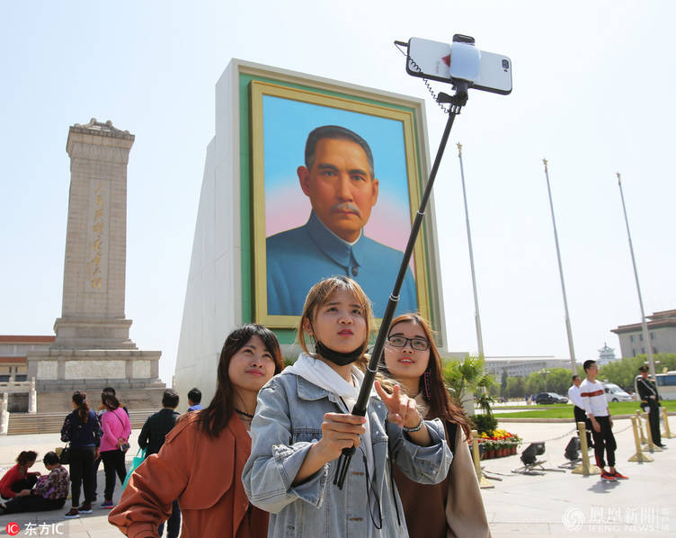 2018年4月27日,北京,游客紛紛在孫中山畫像前拍照留影。當(dāng)天,孫中山巨幅畫像亮相天安門廣場,迎接即將到來的五一國際勞動(dòng)節(jié)。 游客在孫中山畫像前拍照留影